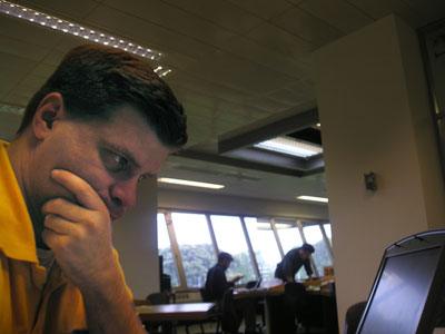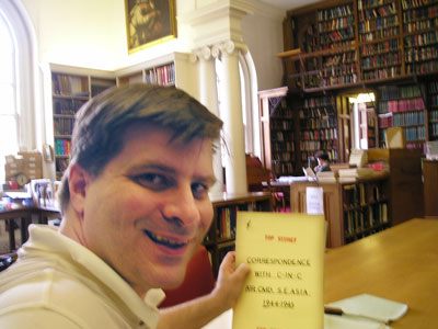 Historian at Work: Doing research in 2005 at the library of Christ Church College at the University of Oxford in the papers of Sir Charles Portal for Allies Against the Rising Sun. Portal was the head of the Royal Air Force during World War II. This trip was the last of five that Sarantakes made to England to do research for this book. Notice the “Top Secret” designation on the folder cover.