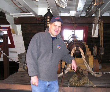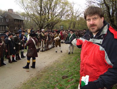 Historical Tourist: Every year people reenact the Lexington and Concord battles. These events often deliver many intangibiles about the past that documents fail to deliver. Back in 1775 the British Army marched out of Boston to Concord and then after taking heavier than expected casualties, the red coats marched back. Along the way, small groups of militia (the “minute men”) shot at the retreating troops. The Battle of the Bloody Angel was fought in front of Hartwell Tavern. Here American militia men form in front of the tavern. Sarantakes is the only person in this photo wearing clothing from the Twenty-First Century.