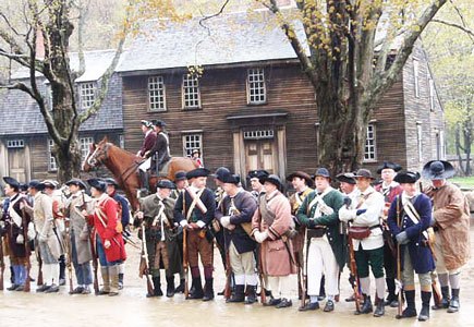 Time Travel: This photograph is far more realistic of something you would have seen in 1775. Here the American militia musters in front of Hartwell Tavern.