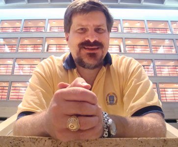 LBJ Scholar: Austin, Texas is Sarantakes’ hometown and when he visits he always visits the Lyndon Baines Johnson Presidential Library. As a result, he has written a number of articles on U.S. diplomatic history during the 1960s. He is part of a small group of scholars that argue that LBJ did much better in foreign policy than one might thing, particularly given his failures in Vietnam. This photo was taken in the atrium of the Library and the red boxes in the background hold unclassified White House documents.