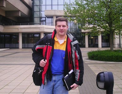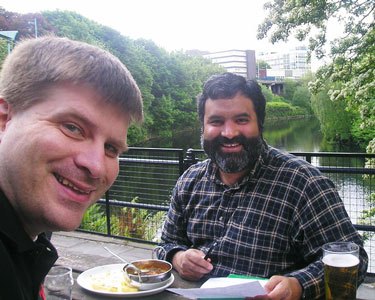 Salford: Sarantakes and Larry Valero eating lunch at the University of Salford in 2004. Valero was the host for Sarantakes while he had a visiting fellowship at Salford, which is located just outside of Manchester, England. The five months he spent in the United Kingdom were enormously productive and altered his career in many ways. Crescent House, where their offices were located, is visible in the background.