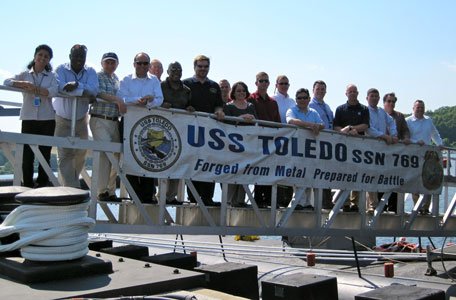 In the Navy: The USS Toledo (SSN-769) is a Los Angeles-class submarine stationed in Groton, Connecticut. In 2010 Sarantakes and his Naval War College Students took a real tour—not like some of the museum ships that allow you to only go through one deck of the ship—but the entire submarine, including the periscope. The dominate impression people had from the tour is the tightness of quarters. From Left to Right: CDR Mery-Angela S. Katson, U.S. Navy; CAPT Bethel F. Asante, Ghana Navy; CDR Pavlos Panagiotopoulos, Hellenic Navy; LCDR Thomas H. Shugart III, U.S. Navy; LCDR Sean P. Loofbourrow, U.S. Navy; Col Lloyd I. Terry Jr., U.S. Air Force Reserves; Dr. Nicholas Evan Sarantakes, Ph.D.; COL John J. Strycula, U.S. Army; LCDR Jill R Cesari, U.S. Navy; LtCol Matthew R. Crabill, U.S. Marine Corps; Lt Col Byron B. Anderson, U.S. Air Force; CDR Aristides G Reyes, U.S. Navy; David P. Every of the U.S. Merchant Marine; Col. James C. Brennan, U.S. Marine Corps; CDR Richard M. Stacpoole, U.S. Navy; Alfred R Magleby, U.S. Department of State; and LCDR Charles R. Dwy JR, U.S. Navy.