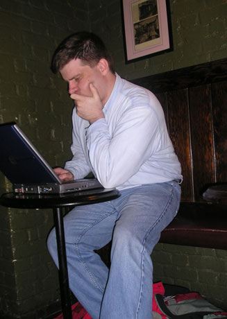 Writer at Work: In the Ye Olde Cheshire Cheese pub. Known as a writer's place, Charles Dickens, Alfred Tennyson, and Sir Arthur Conan Doyle frequented this establishment. Sarantakes is writing an article on Anglo-American relations.